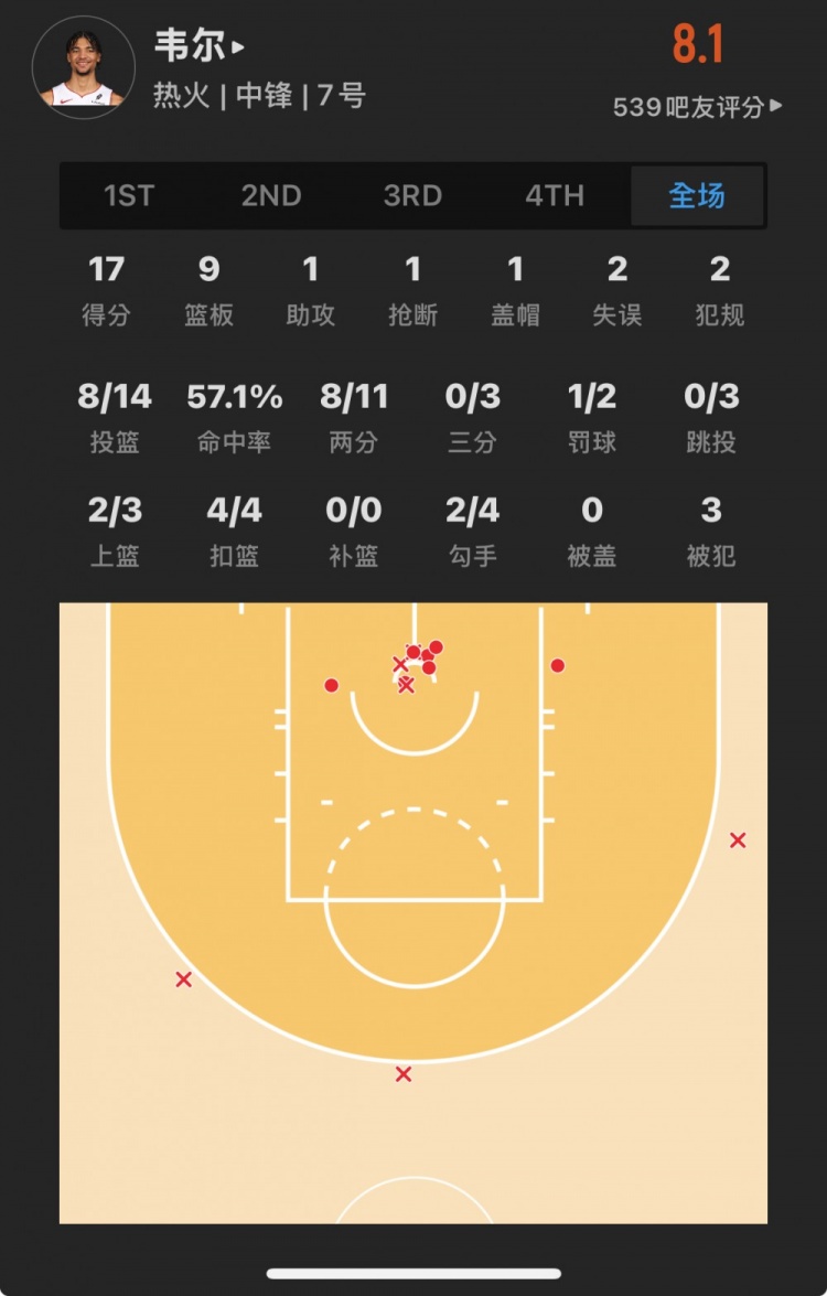 菜鸟丨爵士32号秀20分10板 科利尔16+4+8+4断 热火中锋韦尔17+9
