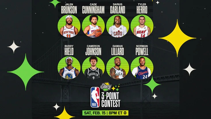 02月16日讯 NBA2025年旧金山全明星周末三分大赛在大通中心进行,参赛球员:布伦森(尼克斯)、凯德-康宁汉姆(活塞)、加兰(骑士)、利拉德(雄鹿)、希尔德(勇士)、卡梅隆-约翰逊(篮网)、希罗(热火)和诺曼-鲍威尔(快船)!
