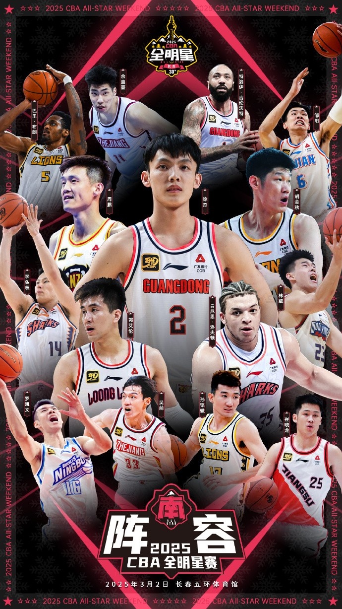 2月20日讯 CBA官方宣布了2025CBA全明星周末的阵容名单,详情如下: