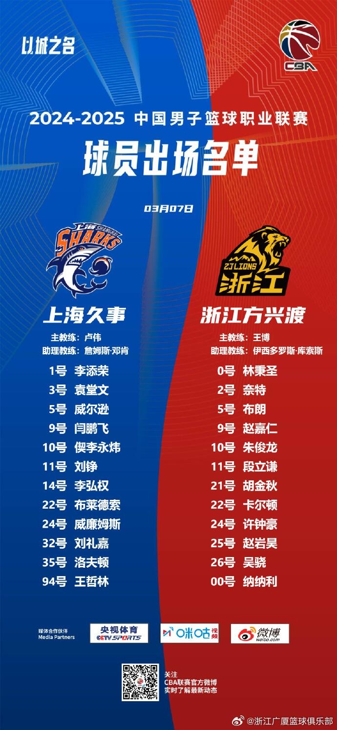 上海VS广厦大名单:洛夫顿王哲林胡金秋领衔 朱俊龙赵岩昊在列