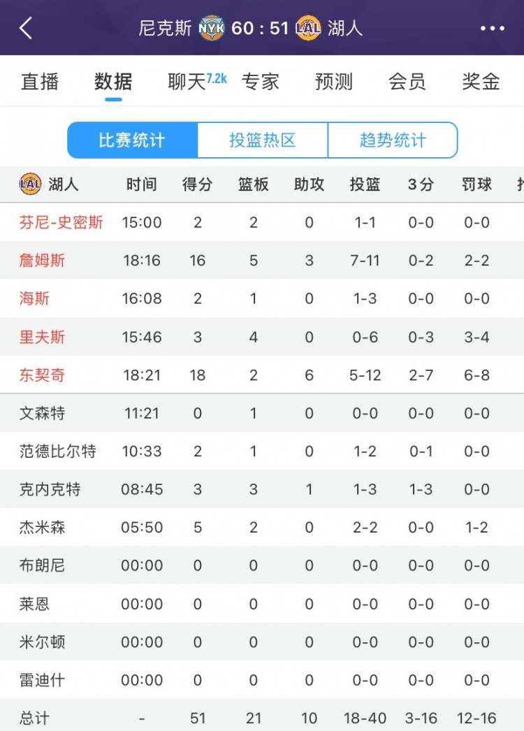 上半场比赛,湖人外线投射不在线,射手也不准,全队16投仅3中,命中率仅18.8%:东契奇7中2,克内克特3中1,詹姆斯2中0,里夫斯3中0,范德比尔特1中0。