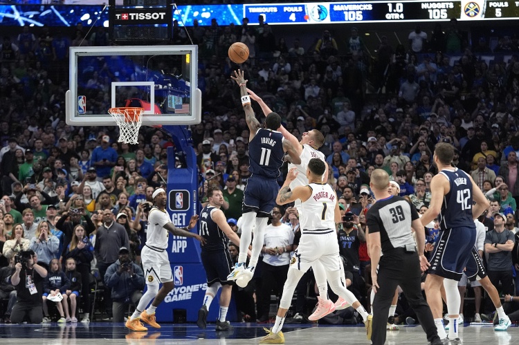 3月18日讯 一年前的今天,在独行侠107-105险胜掘金的比赛中,欧文在比赛最后时刻持球突破,在三分线内一步的位置用左手抛投,皮球划过上前补防的约基奇的指尖,球进灯亮,完成绝杀。