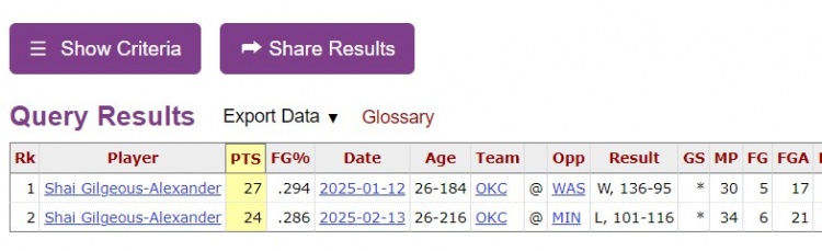 根据数据统计,亚历山大今天的命中率(24.1%)是赛季至今的最低,本场比赛之前,SGA有过两场命中率低于3成的比赛,一场是对阵奇才17中5(29.4%),一场是对阵森林狼21中6(28.6%)。