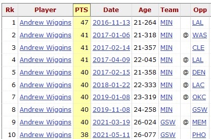 至此,维金斯生涯单场得分前十全部迈入40+,有8次在森林狼获得、1次勇士、1次热火。