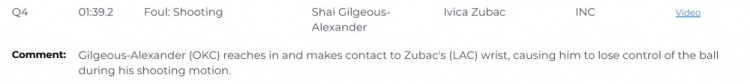 比赛最后1:39,快船落后99-100落后1分,亚历山大(雷霆)伸手接触到祖巴茨(快船)的手腕,导致他在投篮动作中失去对球的控制。