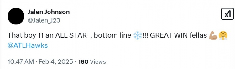 赛后,老鹰前锋杰伦-约翰逊更推道:“那个11号男孩是全明星,最差都应该是!!!非常棒的胜利???????????? 。”