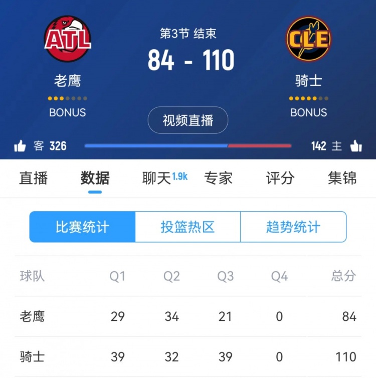 1月31日讯 NBA常规赛,骑士三节110-84领先老鹰。