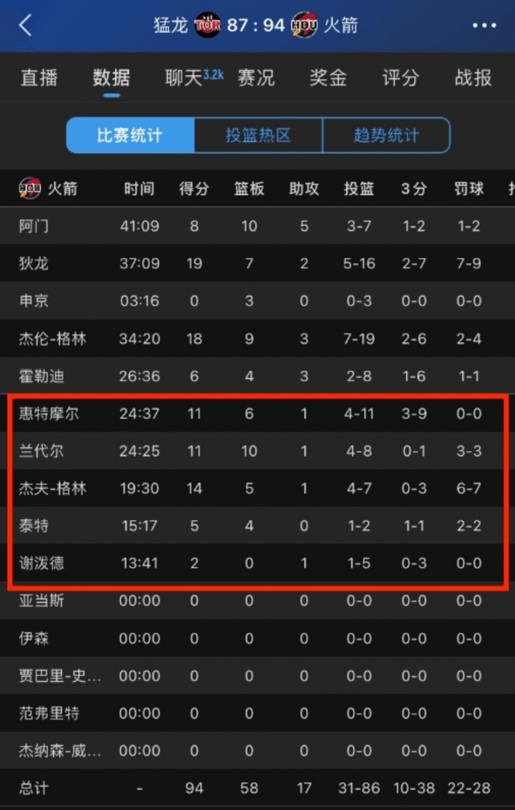 本场比赛,火箭替补球员进攻端为球队作出巨大贡献,5人轮换上场皆有得分,其中3人上双,合砍全队94分中的43分。