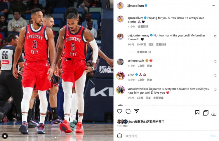 赛季报销!CJ祝福德章泰-穆雷 后者:你这样的不多了 永远的兄弟 2月2日讯 此前鹈鹕官方宣布,球队后卫德章泰-穆雷被诊断为右跟腱断裂,赛季报销。队友CJ在INS上为其送上祝福:“5号,为你祈祷。你知道我们之间的情谊永存。????????????”穆雷则是回复:“像你这样的不多 2025/02/02