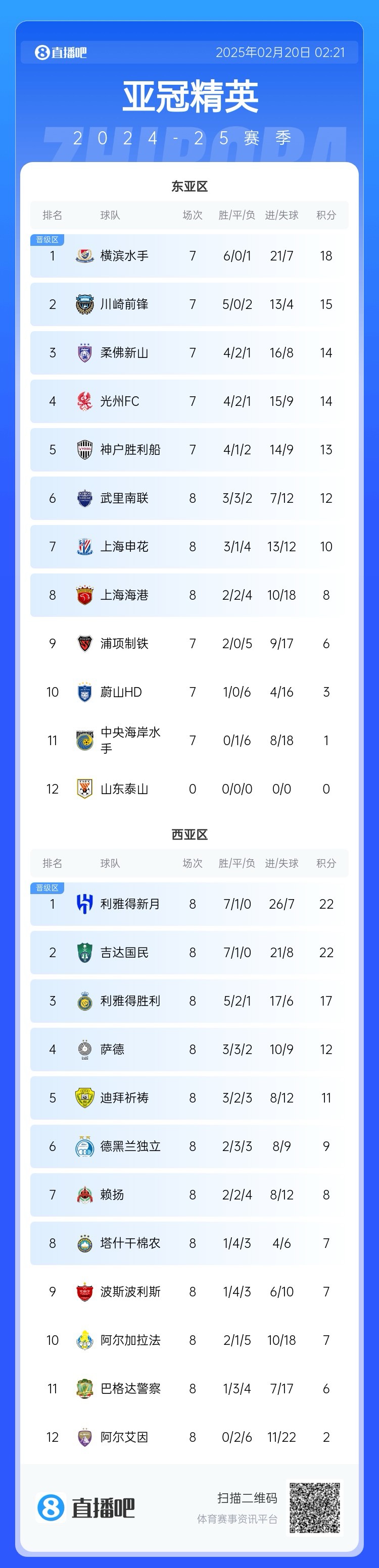 ▶️2025年02月19日 亚冠-阿扎迪破门库什基建功 德黑兰独立2-0赖扬 ▶️2025年02月19日 亚冠-利雅得新月2-0迪拜祈祷净胜球优势位居榜首 多萨里建功 ▶️2025年02月19日 无缘欧冠16强!十人AC米兰总比分1-2费耶诺德遭淘汰 特奥假摔染红 ▶️2025年02月19日 亚冠-艾曼破门奥布雷贡点射 柔佛新山5-2大胜浦项制铁 ▶️2025年02月19日 亚冠-吴厚性两球救主 光州FC2-2逼平武里南联 ▶️2025年02月19日 亚冠-埃里森点射马尔西尼奥破门 川崎前锋2-0中央海岸水手 ▶️2025年02月18日 U20亚洲杯-十人吉尔吉斯斯坦0-4卡塔尔小组垫底 卡塔尔排第三 ▶️2025年02月18日 小组第二出线!国青1-2澳大利亚将战B组第一 蒯纪闻精彩凌空破门 ▶️2025年02月18日 保留出线希望!亚冠-申花4-2十人神户 米内罗戴帽陈晋一低射破门 ▶️2025年02月18日 意甲-皮纳蒙蒂破门科尔内替补建功 热那亚2-0威尼斯 ▶️2025年02月18日 亚冠-托尼破门菲尔米诺建功 吉达国民4-2阿尔加拉法 ▶️2025年02月18日 净胜球优势登顶!巴萨1-0巴列卡诺西甲4连胜 莱万点射制胜 ▶️2025年02月18日 亚冠-马瓦斯破门卢卡斯建功 巴格达警察2-0送艾因出局 ▶️2025年02月18日 亚冠-里亚斯科斯双响海多斯点射 塔什干棉农2-1萨德取首胜 ▶️2025年02月18日 亚冠-利雅得胜利0-0波斯波利斯锁定第三 C罗、杜兰轮休