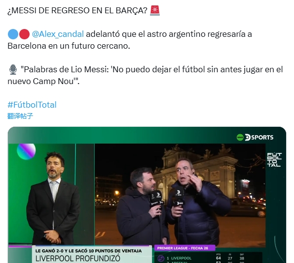 Alex candal透露,梅西将在不久的将来回到巴塞罗那。他还表示:“梅西的话是‘在新诺坎普球场踢球之前,我不能离开足球。’”
