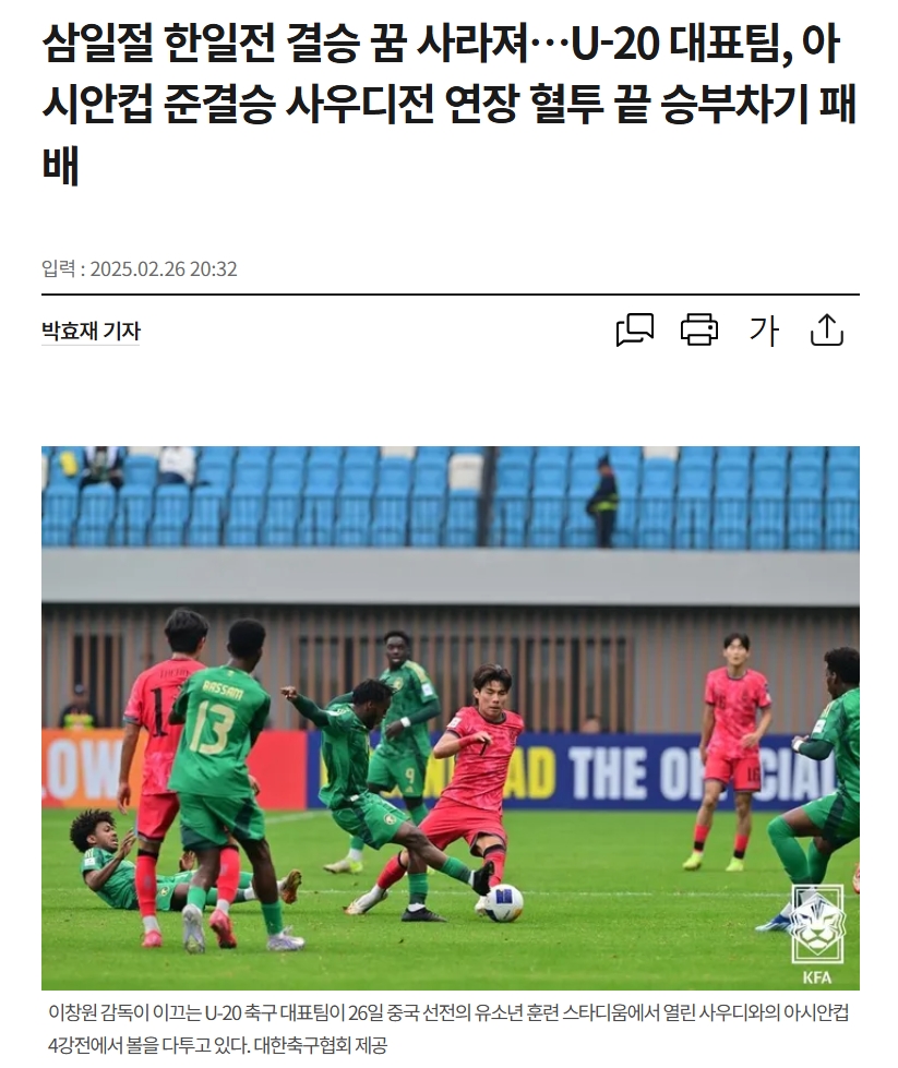 3月1日韩日决赛的梦想已经破灭……亚洲杯半决赛中,韩国U20在点球大战中输给沙特阿拉伯队