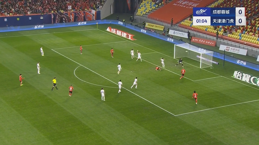 03月02日讯 中超第二轮,成都蓉城vs天津津门虎,比赛第2分钟,周定洋开场1分钟门前垫射,可惜皮球打在横梁弹出。