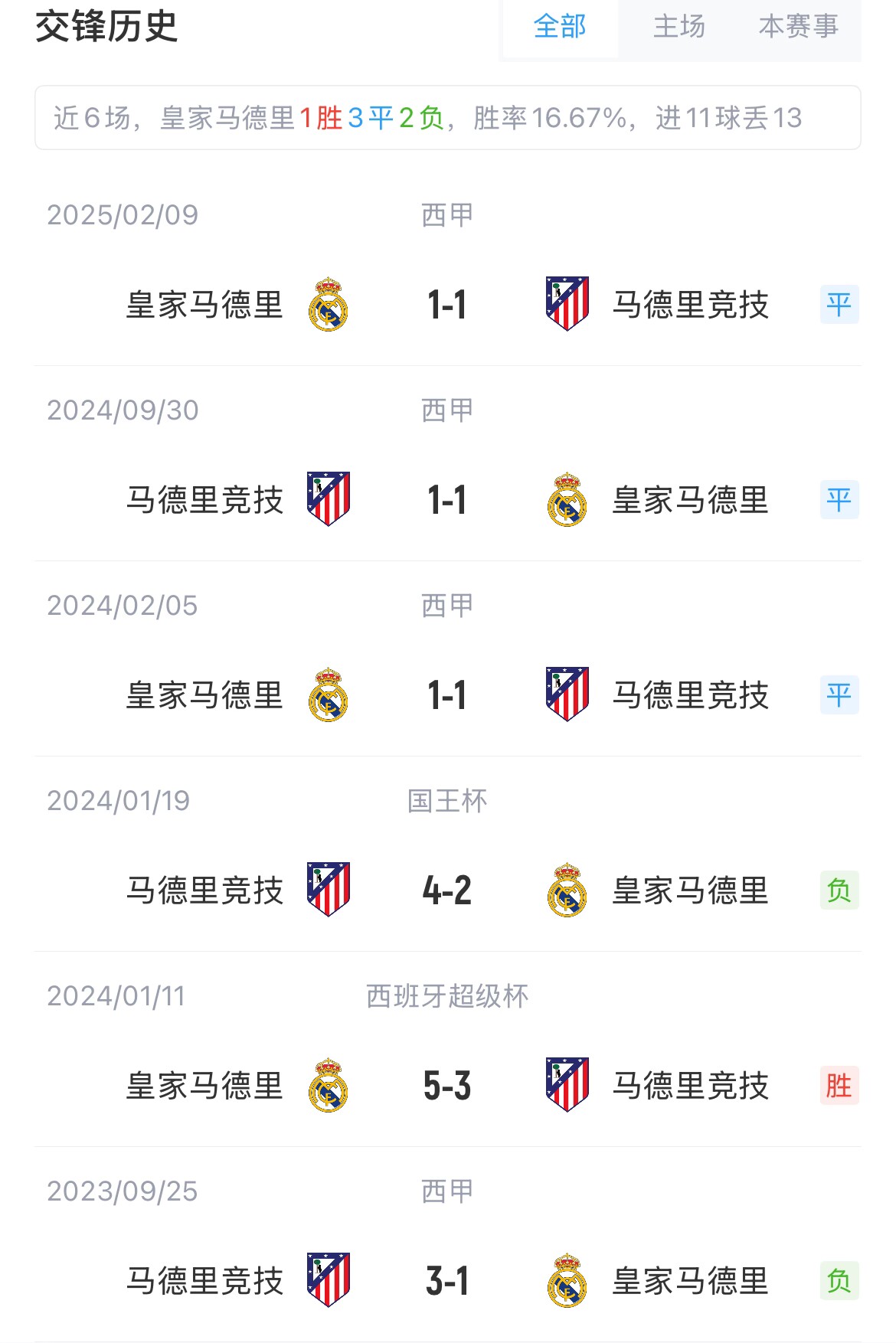 皇马与马竞在欧战共交手10次,皇马5胜2平3负,其中两次在欧冠决赛战胜马竞。本赛季,两队在西甲的两次对决均战成1-1。