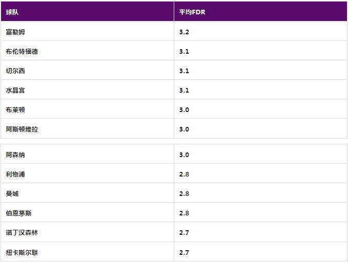 根据赛程难度评级系统(FDR),我们可以从纸面上看到各支球队的赛程难度,该系统将每场比赛的难度从1(容易)到5(困难)进行排序,数值越高代表比赛难度越大。