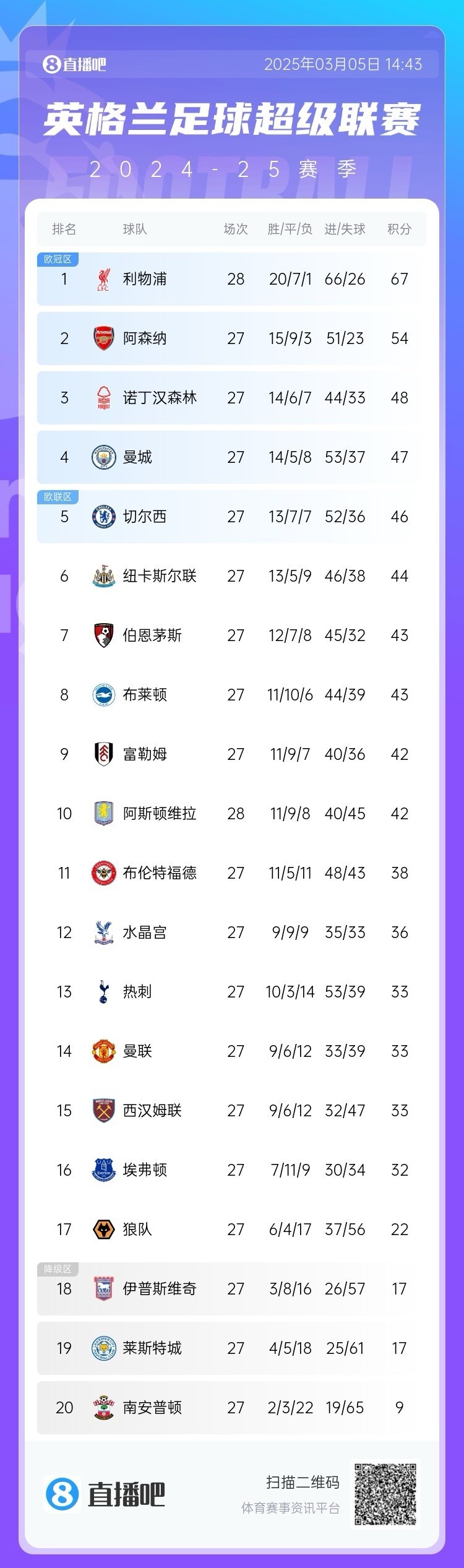 本赛季到目前为止,领头羊利物浦拿到下赛季欧冠资格几乎是板上钉钉,排名第二的阿森纳领先第五名切尔西8分,有望连续第三个赛季拿到欧冠资格。而第三名诺丁汉森林和第十名阿斯顿维拉的差距只有6分,因此这八支球队可能会上演英超历史上最激烈的欧战资格争夺战。