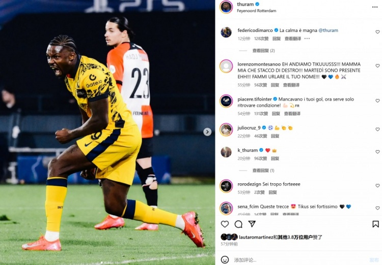本场比赛劳塔罗与小图拉姆双双破门,赛后两人也分别在个人社媒晒出本场进球后怒吼庆祝的照片。