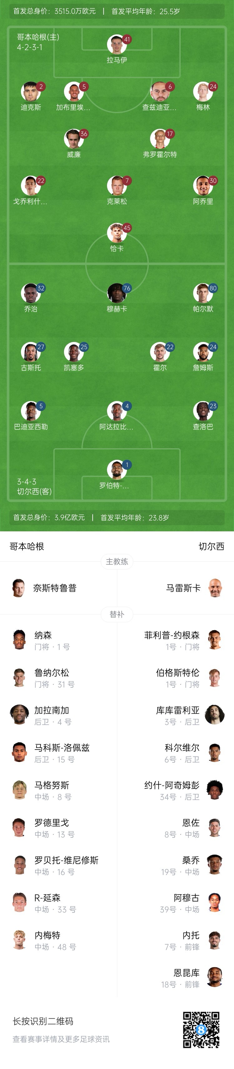 哥本哈根替补:1-纳森-特罗特、31-鲁纳尔松、4-穆纳什、15-马科斯-洛佩兹、8-马格努斯、13-罗德里戈-休斯卡斯、16-罗贝托-维尼修斯、33-R-延森、48-内梅特