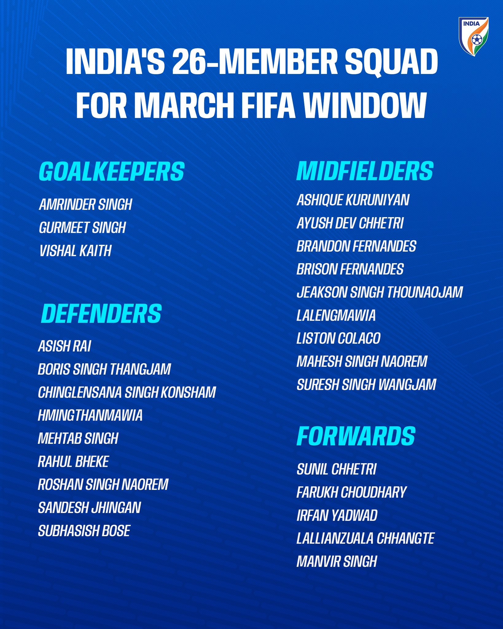 印度将在3月19日友谊赛对阵马尔代夫,3月25日亚足联亚洲杯预选赛对阵孟加拉国。