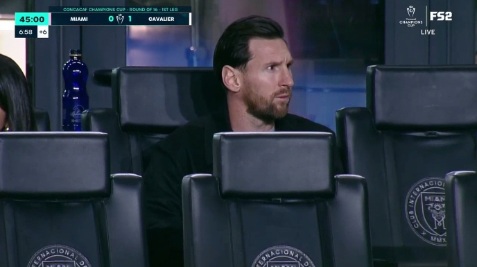 在上半场补时阶段,客队球员阿特金森破门,但是裁判观看VAR后判定进球越位。迈阿密被进球时梅西在场边愁容满面,VAR检查时梅西也是坐不住了站了起来。