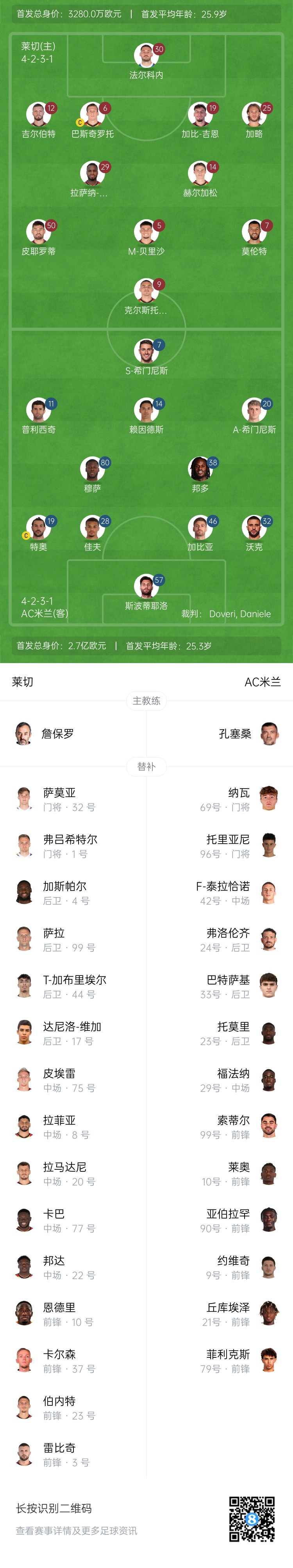米兰替补:69-拉波-纳瓦、96-托里亚尼、42-泰拉恰诺、24-弗洛伦奇、33-巴特萨基、23-托莫里、29-福法纳、99-索蒂尔、10-莱奥、90-亚伯拉罕、9-约维奇、21-丘库埃泽、79-菲利克斯