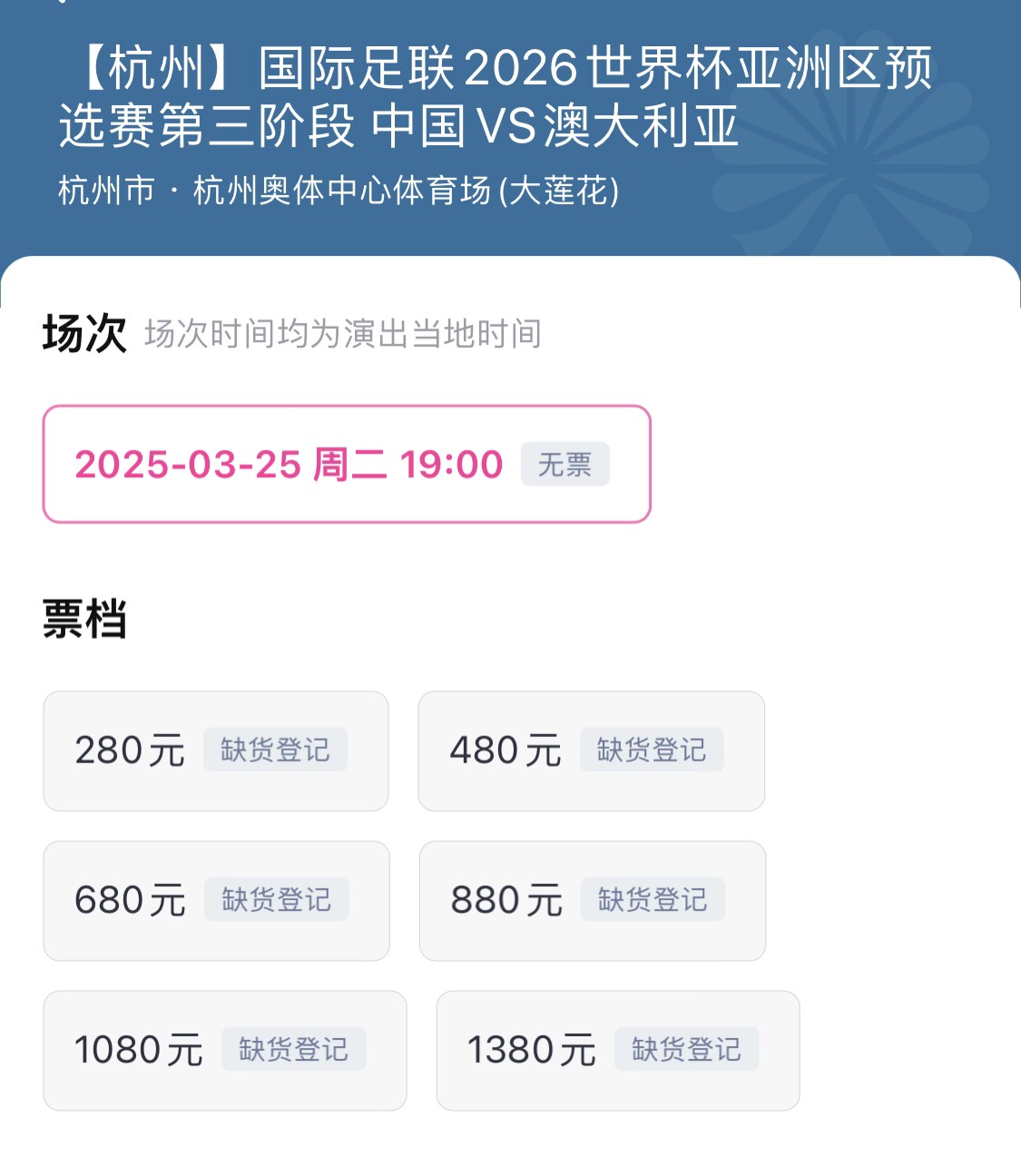 3月25日18强赛国足vs澳大利亚门票早已售罄,官方票务信息显示,3月11日0:00起停止退票。这个时间点将成为最后的“捡漏”(回流票)的机会。