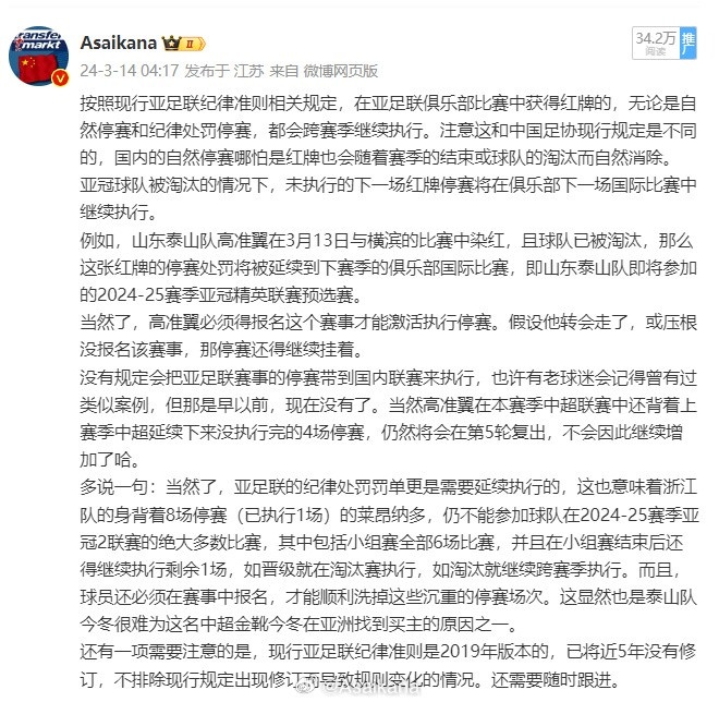而亚足联则相反,红牌自然停赛需要跨赛季执行。现中足联和中国足协已经分家,中足联目前还是和中国足协保持一致,如果中足联日后出台与之不同的新的停赛执行细则,职业联赛范畴内当然也是要以中足联的规定为准。