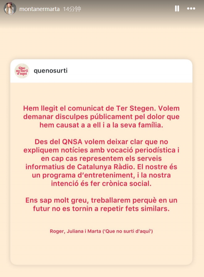 从节目《Que no surti d’aquí》的角度,我们想明确表示,我们并非以新闻视角报道事件,也不代表加泰罗尼亚广播电台的新闻服务。我们的节目是娱乐性质的,我们的目的是进行社会纪实。