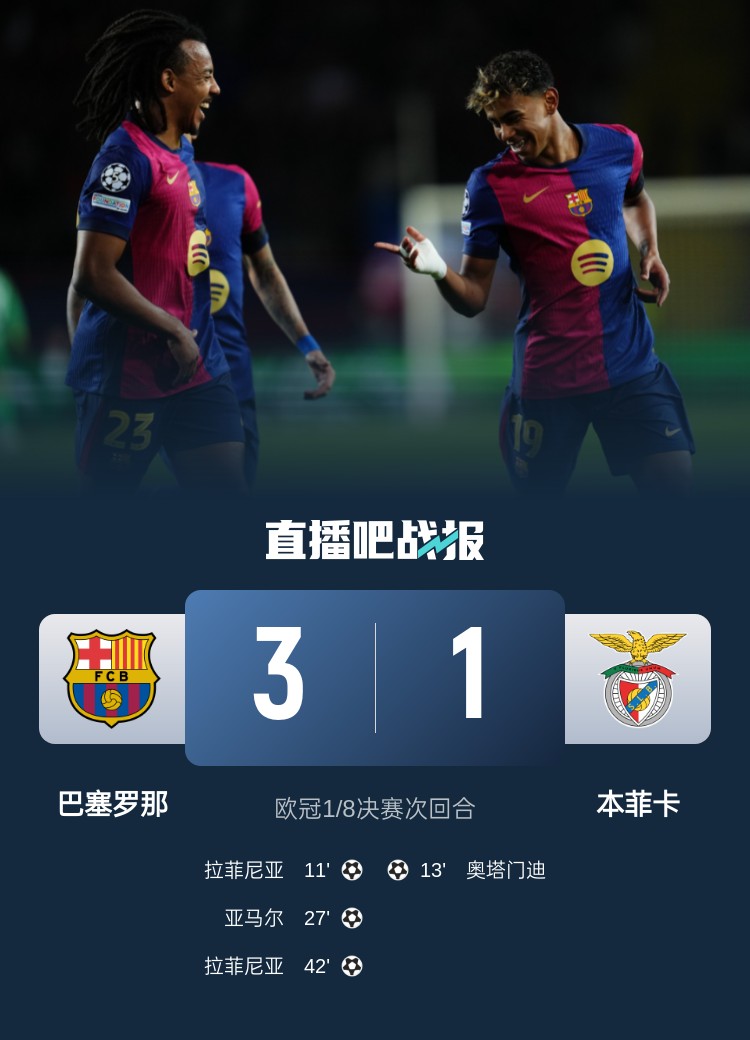 双杀进8强!巴萨3-1总比分4-1本菲卡 拉菲尼亚2射1传亚马尔传射