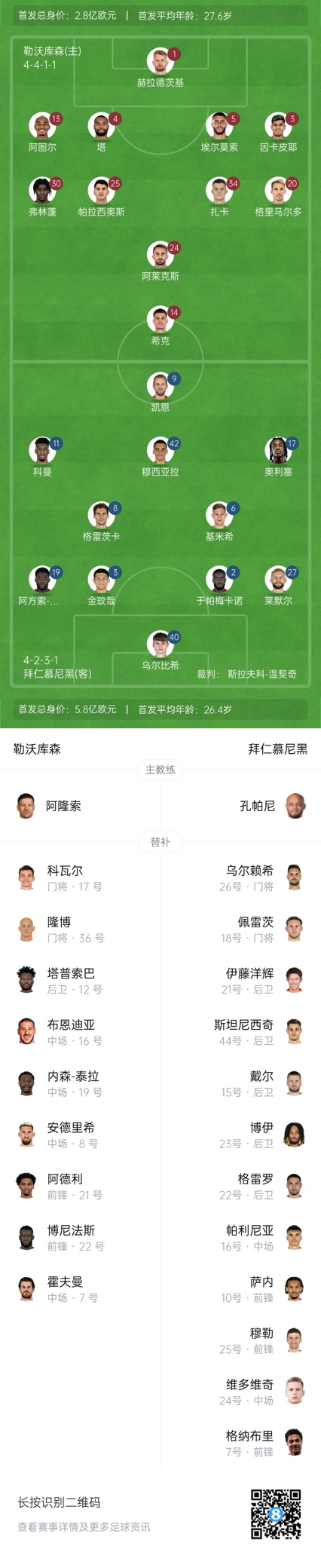 勒沃库森首发:1-赫拉德斯基、4-塔、5-埃尔莫索、3-因卡皮耶、13-阿图尔、34-扎卡、25-帕拉西奥斯、30-弗林蓬、20-格里马尔多、24-阿莱克斯-加西亚、14-希克