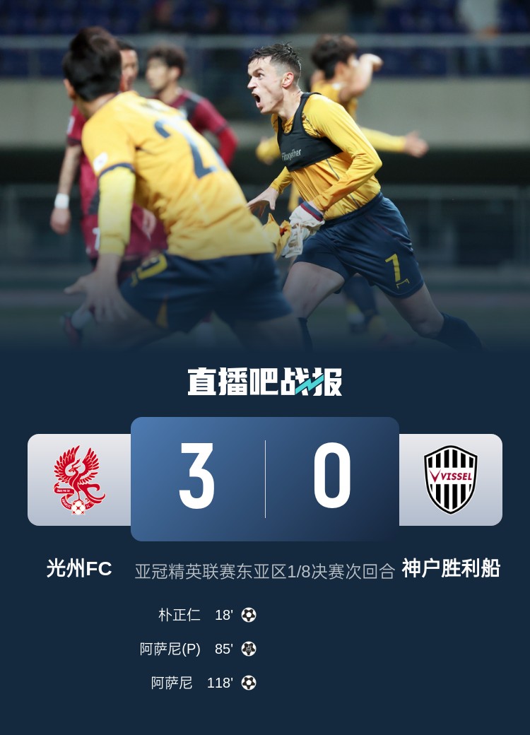 3月13日讯 亚冠精英联赛1/8决赛次回合,光州FC在首回合客场两球落败的情况下,主场完成逆转,以3-0的比分击败神户胜利船,晋级下一阶段。