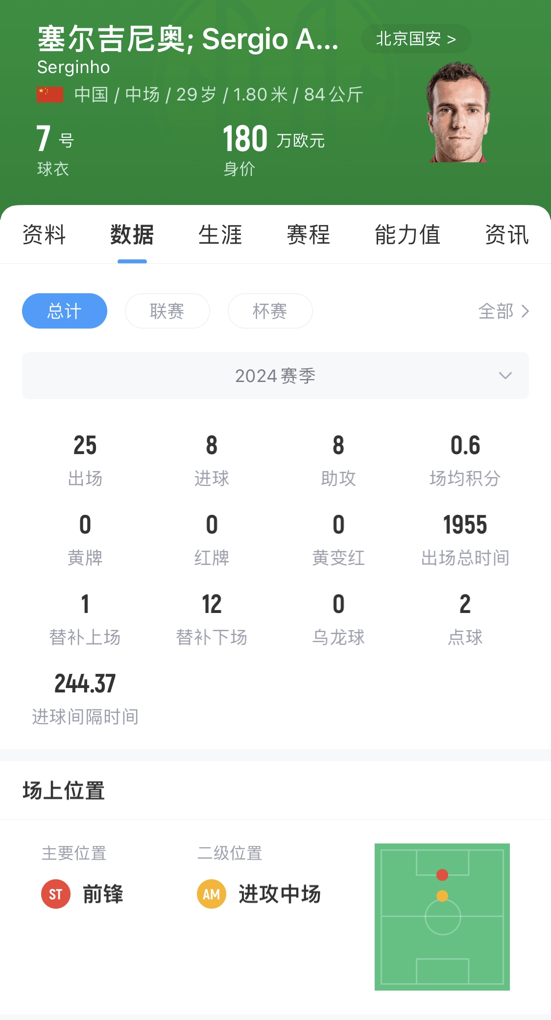 1995年3月15日出生的塞尔吉尼奥原来拥有巴西和意大利双重国籍,2020年1月加盟长春亚泰,代表球队出战100场打进30个进球,完成23次助攻。2025赛季以40万欧元的身价转会至北京国安。转换会籍成功的第二天,塞尔吉尼奥也将迎来自己的30岁生日。