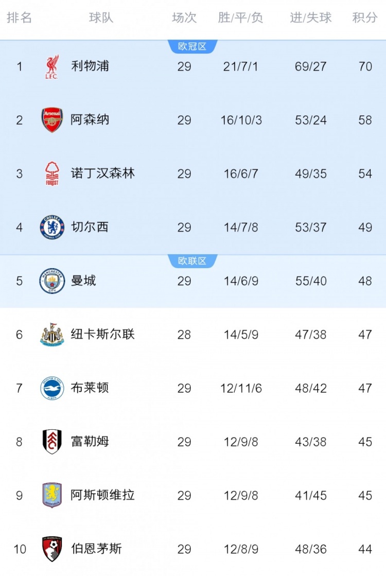 英超积分榜前十: