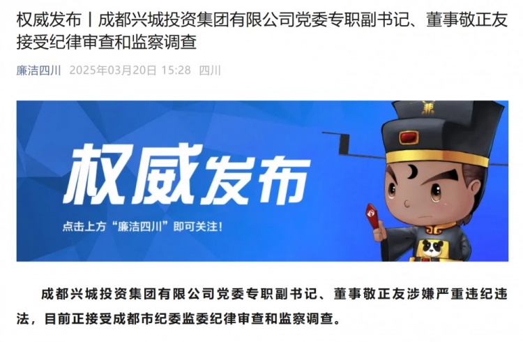 3月20日讯 根据“廉洁四川”公众号消息,成都兴城投资集团有限公司党委专职副书记、董事敬正友接受纪律审查和监察调查。