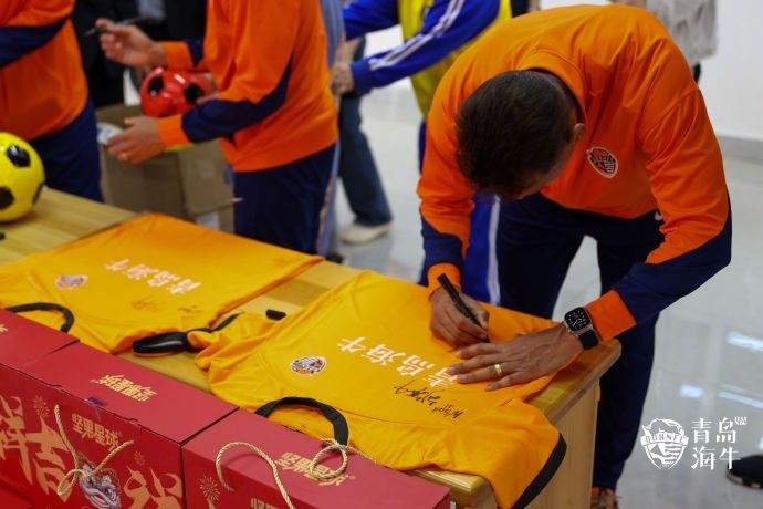 初春的青岛充满暖意,海牛俱乐部球员们的到来更是给孩子们带来了欢声笑语。俱乐部为儿童福利院捐赠了牛奶、坚果、足球及其他生活用品,并为儿童福利院送上签名足球、球衣、专属球衣等纪念礼品。