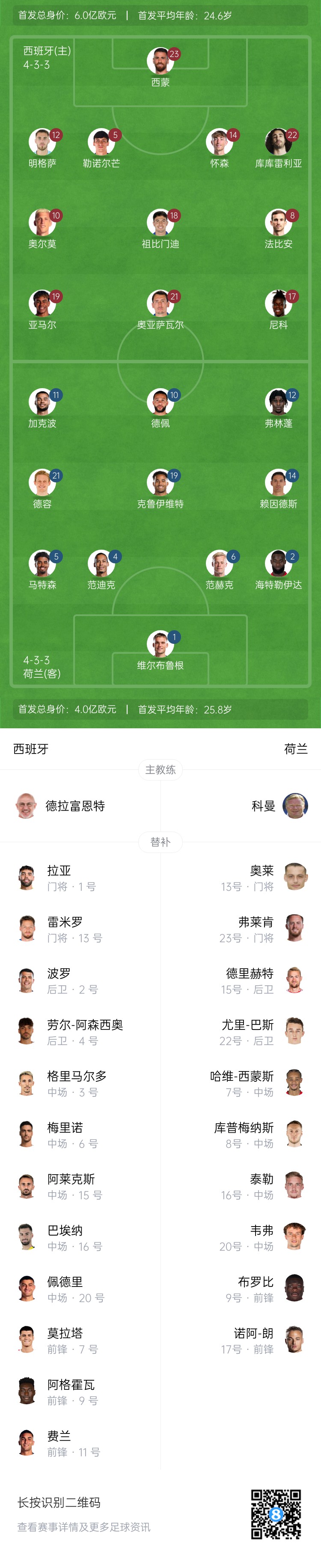 西班牙首发:23-乌奈-西蒙、12-明格萨、5-勒诺尔芒、14-怀森、22-库库雷利亚、18-祖比门迪、8-法比安、10-奥尔莫、19-亚马尔、17-尼科-威廉姆斯、21-奥亚萨瓦尔