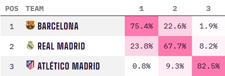 本轮西甲,马竞客场1-1战平西班牙人,赛后多赛距离榜首已有6分之差。数据机构Opta给出的最新数据显示,马竞本赛季西甲夺冠概率只剩下0.8%,基本可以宣布退出争冠。