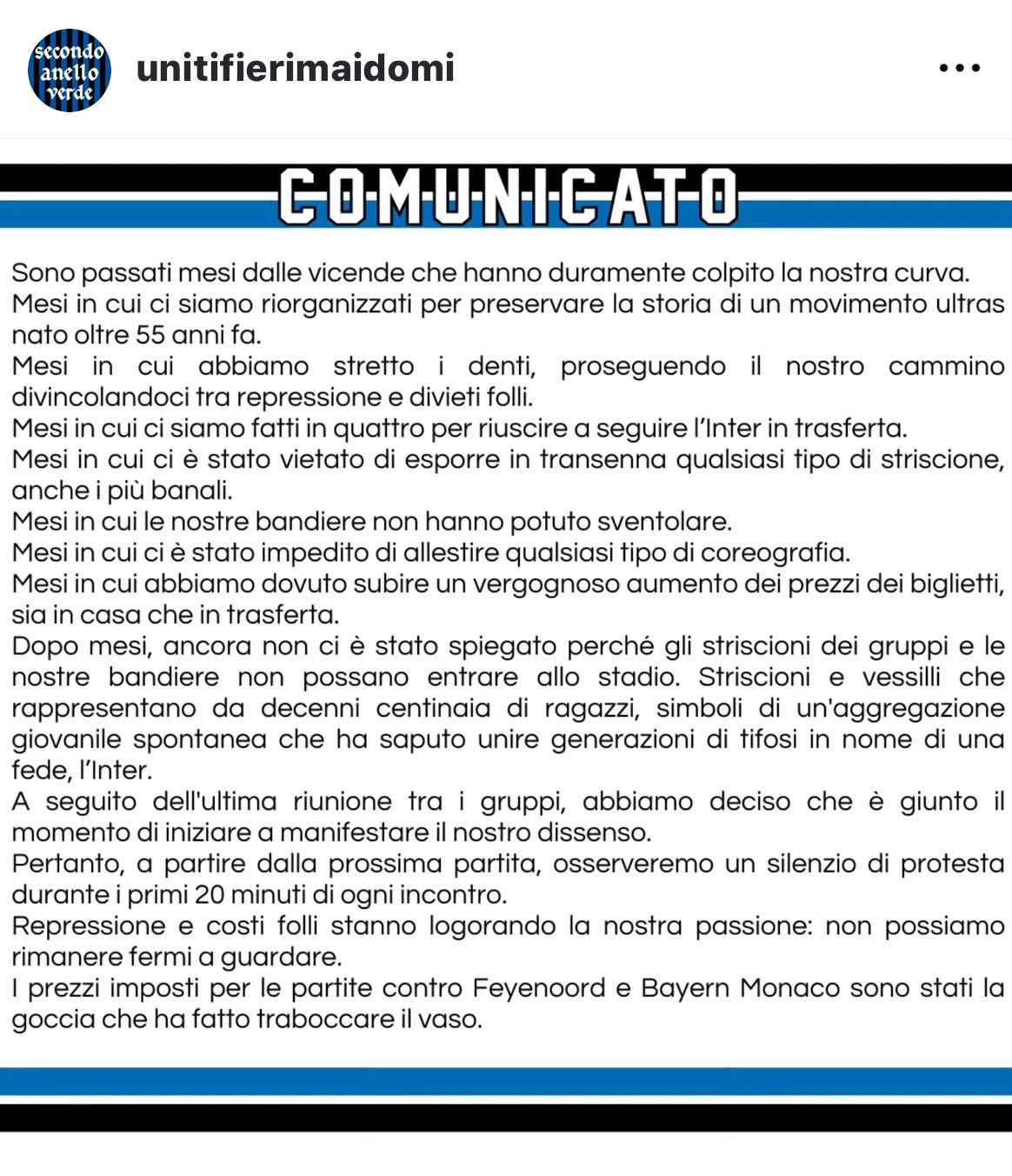 3月30日讯 国米北看台球迷组织发布公告,宣布在之后每场比赛的前20分钟保持沉默,抗议票价过高、主场禁止携带标语等情况。