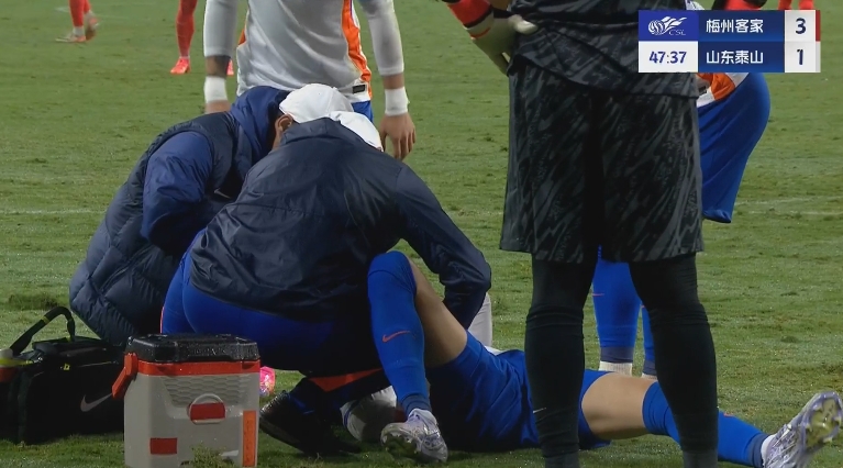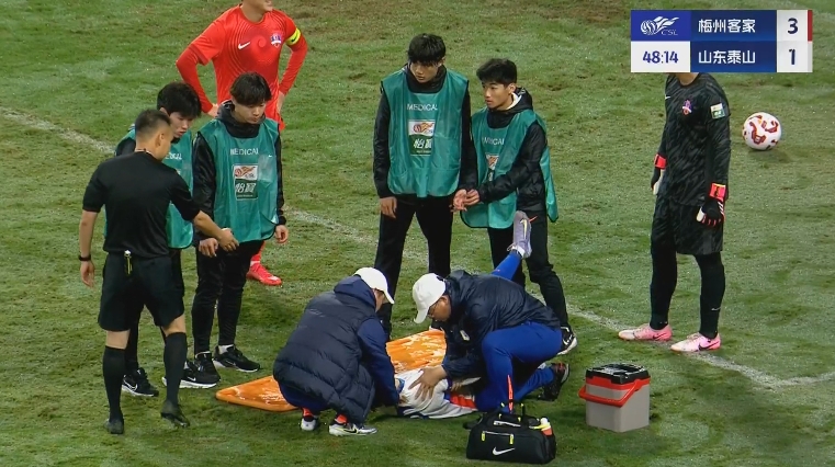 3月29日进行的中超第3轮比赛,泰山vs梅州第50分钟,王彤远射后为了躲避封堵失去平衡摔地,随后被担架抬下,张弛替补登场。