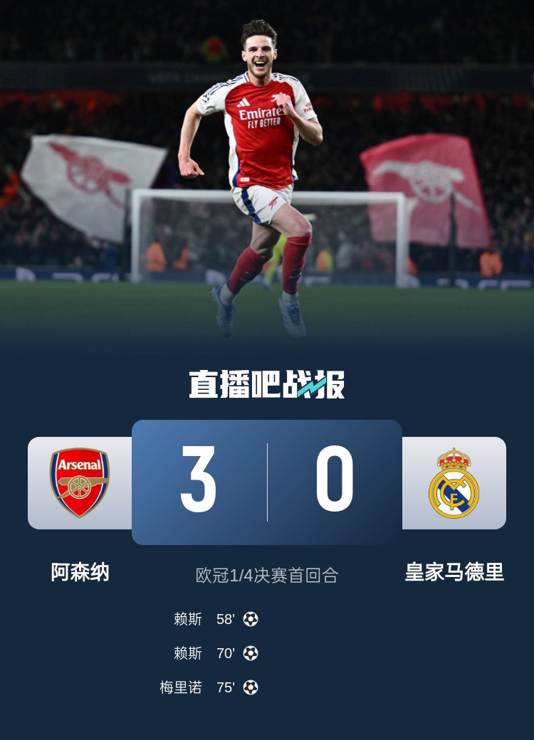 4月9日讯 欧冠1/4决赛首回合,赖斯任意球梅开二度,阿森纳在主场3-0完胜皇马。