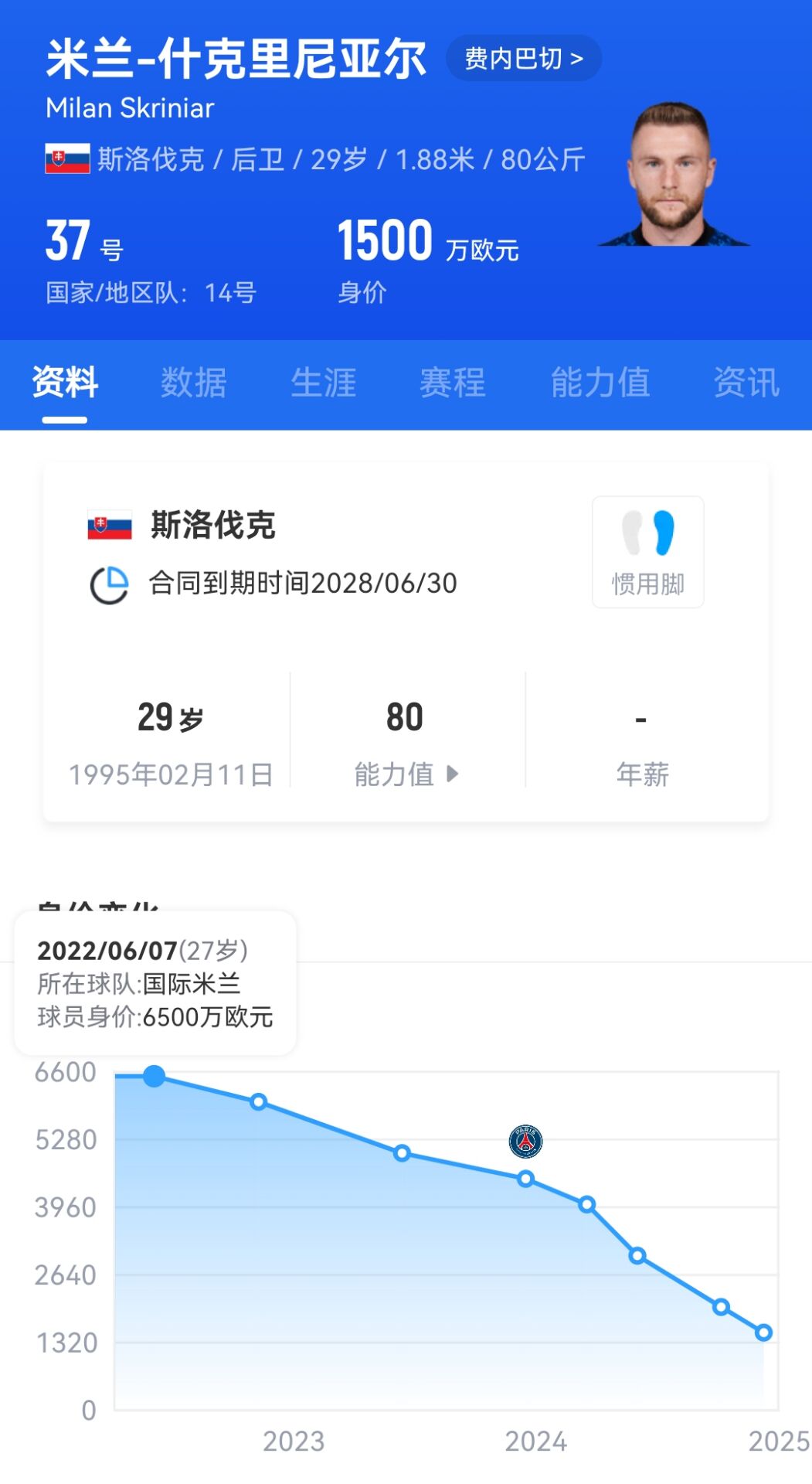 什克里尼亚尔今年29岁,本应是中卫的黄金年龄,但在2023年自由身加盟巴黎之后,他的生涯轨迹断崖式下滑,身价从2年半暴跌5000万欧元,本赛季他多次被排除出巴黎阵容,总共只有5次出场。