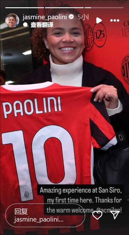 与此同时,保利尼还获赠一件印有她名字的米兰10号球衣,她在社媒写道:“在圣西罗的非凡体验,这是我第一次来这里,谢谢米兰的热烈欢迎。”