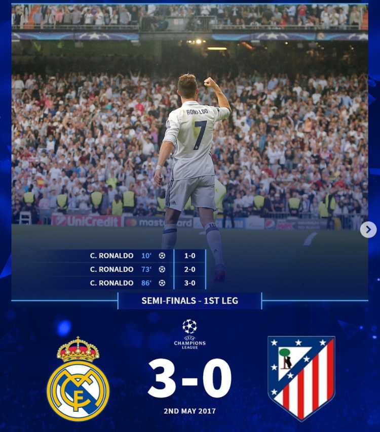 2017年5月欧冠半决赛首回合,皇马主场3-0马竞:C罗上演帽子戏法,帮助皇马确立大幅领先优势。