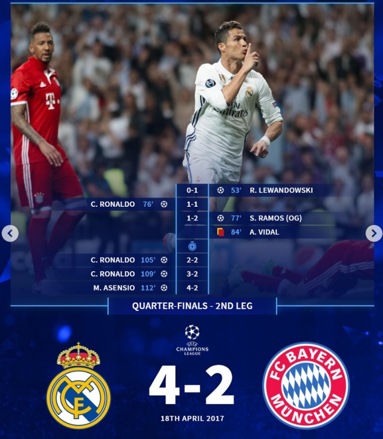 2017年4月欧冠八强战次回合,皇马主场4-2拜仁:C罗上演帽子戏法,帮助皇马淘汰拜仁。