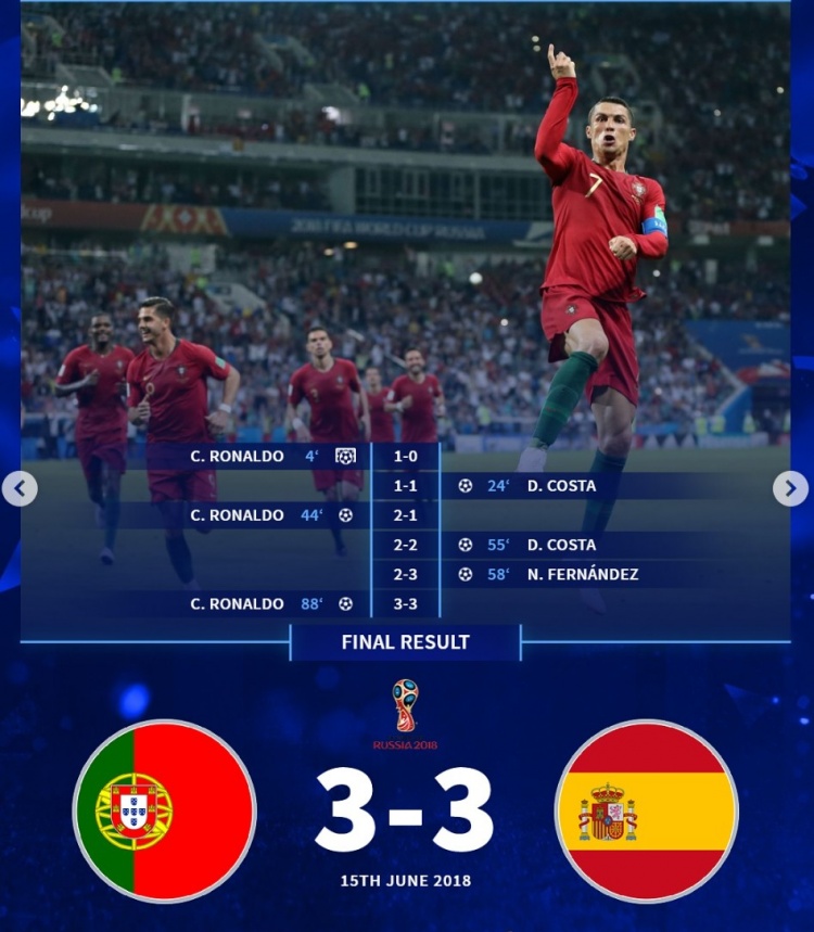 2018年世界杯小组赛,葡萄牙3-3西班牙:迭戈-科斯塔双响,纳乔穿云箭,C罗上演帽子戏法,最后的任意球破门更是因为他主罚前坚定的眼神,和央视解说“翩若惊鸿婉若游龙”成为经典。