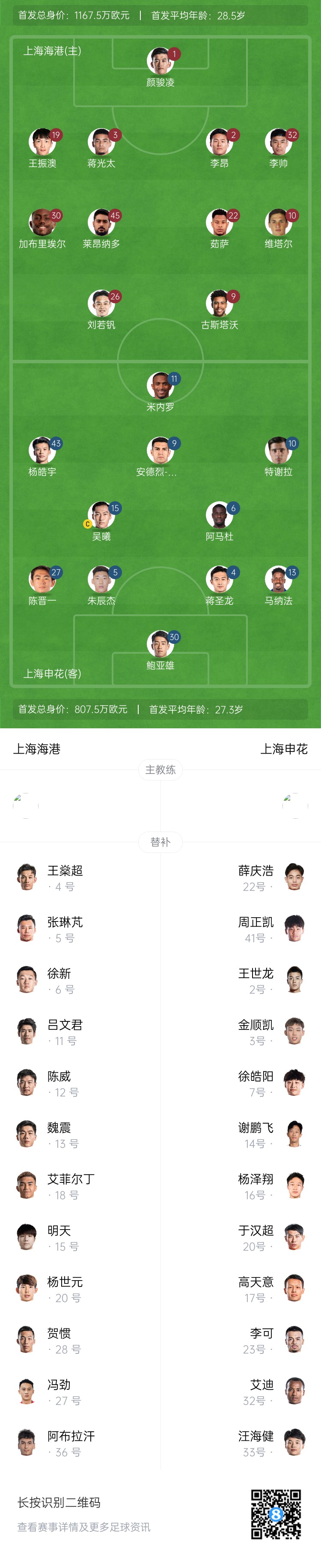 上海申花替补:1-薛庆浩、41-周正凯、2-王世龙、3-金顺凯、7-徐皓阳、14-谢鹏飞、16-杨泽翔、17-高天意、20-于汉超、23-李可、32-艾迪、33-汪海健
