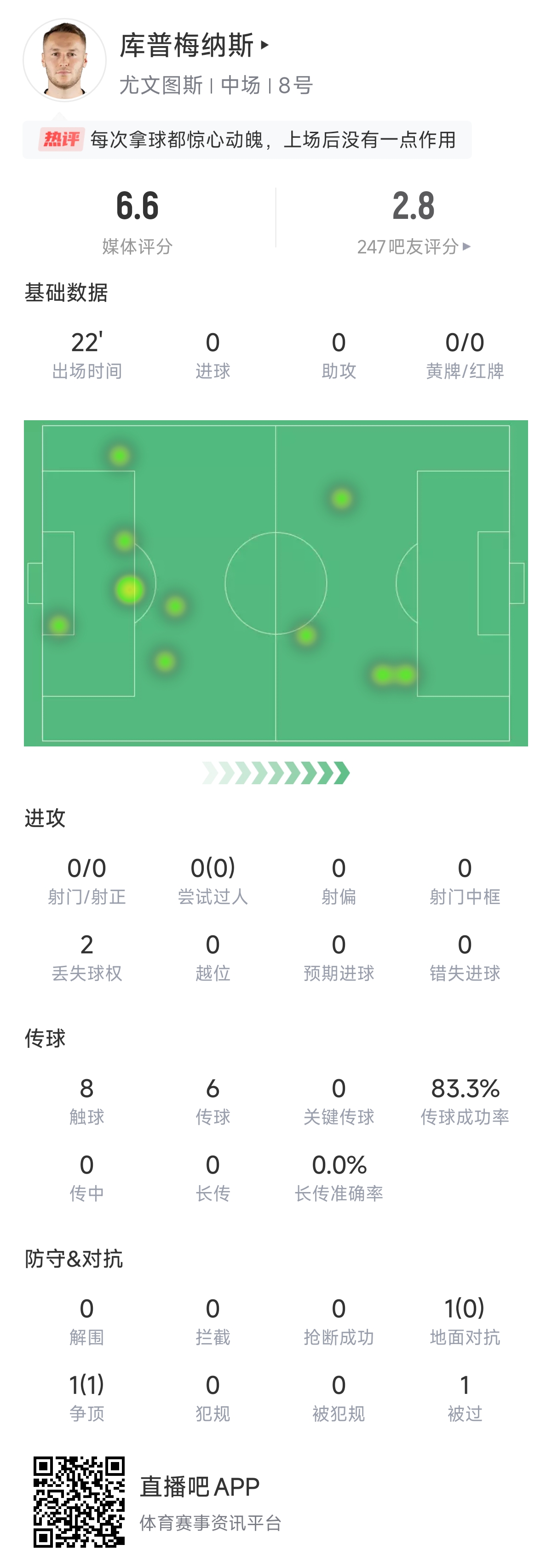 今天的比赛库普梅纳斯出战26分钟(含4分钟补时),仅有8次触球,其中2次丢失球权。他的多项数据挂零,1次对抗也没成功。赛季即将进入冲刺期,这位26岁的荷兰中场,能否找回自己上赛季的神勇状态呢?