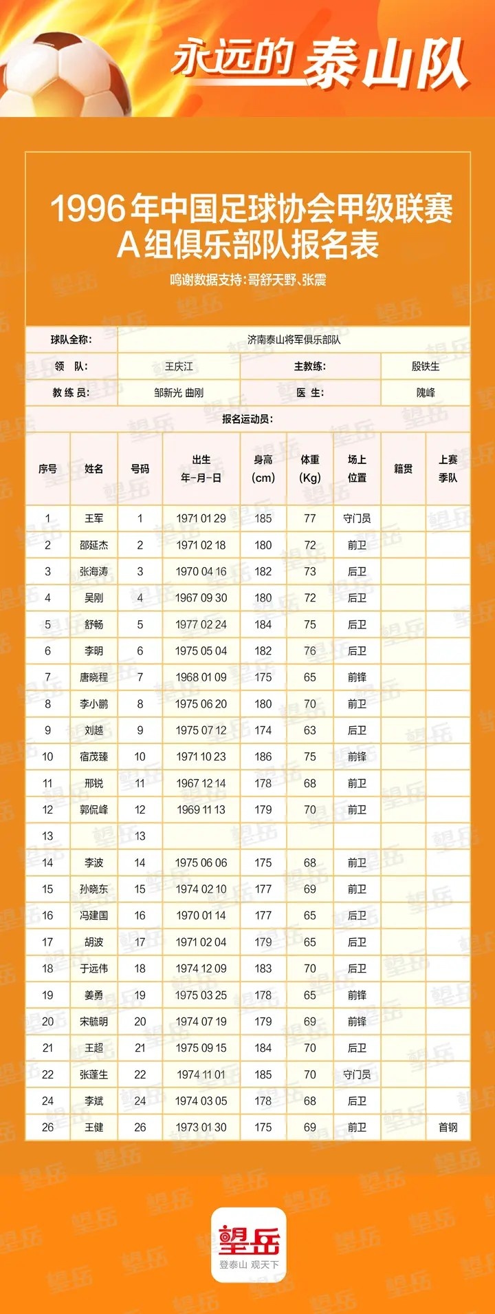 2月13日讯 今天,山东媒体望岳新闻更新了泰山队历史回顾系列,列出了1996赛季泰山队的球员名单以及赛事赛果。