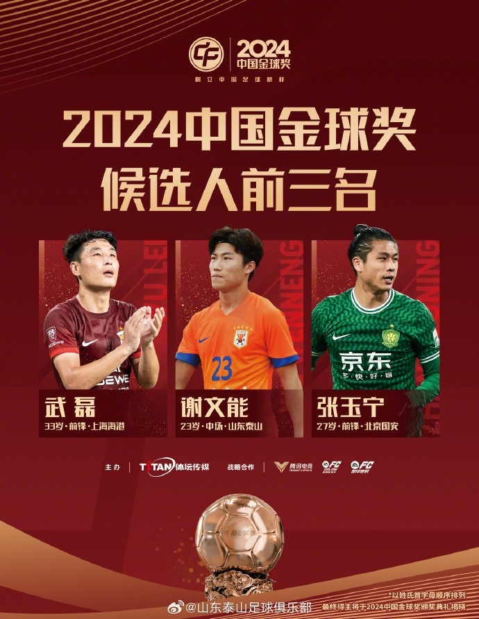 同时,山东泰山队的谢文能也入选2024中国金球奖候选人前三名。期望王大雷和谢文能在俱乐部和国家队的比赛中继续发扬顽强拼搏、永不放弃的泰山足球精神,用他们的实力和激情为中国足球贡献力量。