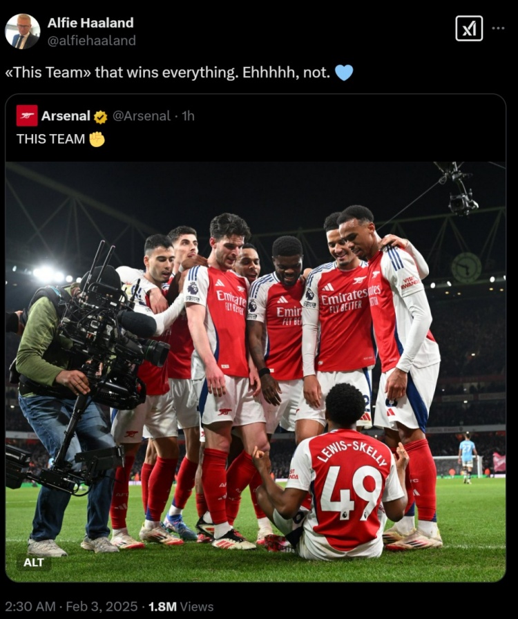 老哈兰德转发斯凯利模仿儿子庆祝照:这个队赢得了一切?额,没有 2月3日讯 本轮英超焦点战,阿森纳5-1大胜曼城。赛后,哈兰德父亲在社交媒体上回击阿森纳。阿森纳社媒晒出斯凯利模仿哈兰德庆祝时,其余球员围绕着他的照片,并写道:这支球队。比赛后,哈兰德的父亲转发了这条 2025/02/03